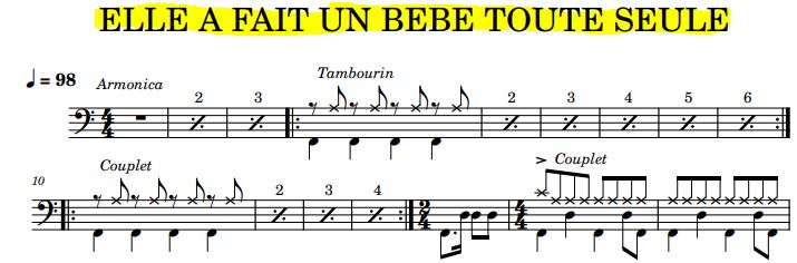 La partition Batterie du titre « Elle a fait un bébé toute seule« de Jean-Jacques Goldman, version originale.