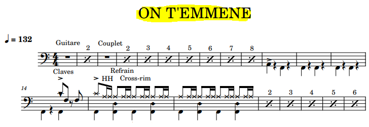 La partition Batterie du titre  » On t’emmène  » de Trois Cafés Gourmands.Version originale.