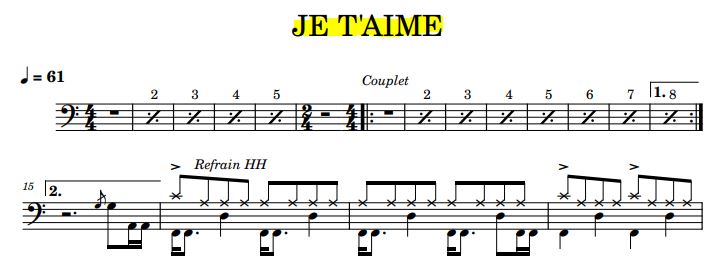 La partition Batterie du titre » Je t’aime » de Lara Fabian. Version originale.
