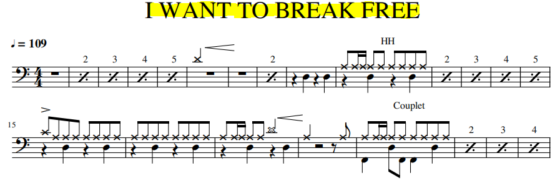 La partition Batterie du titre » I want to break free » du Groupe Queen, version originale.