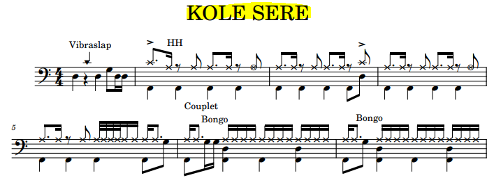 La partition Batterie du titre » Kolé Séré » de Philippe Lavil & Jocelyne Beroard. Version originale.