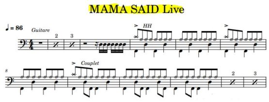 La partition Batterie du titre » Mama said » de Lenny Kravitz, Version Live.