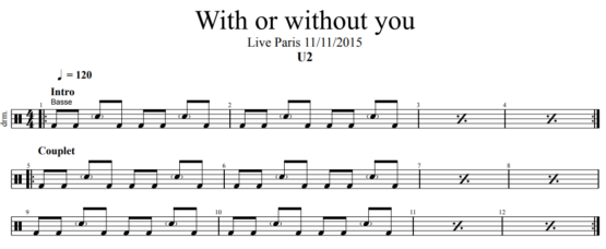 La partition Batterie du titre » With or without you » du Groupe U2 version Live.