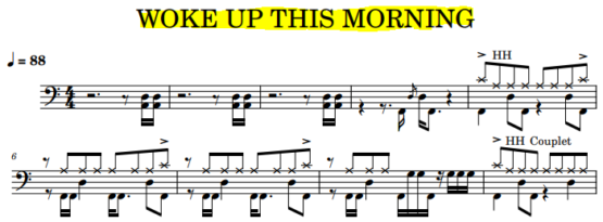 La partition Batterie du titre » Woke up this morning » du Groupe Nickelback. Version originale.